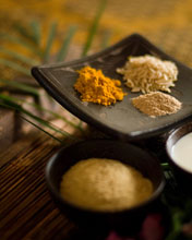 This treatment originated in the palaces of Java in the 17th century, and was enjoyed by Javanese princesses as they prepared for their wedding day. The Lulur is a truly delicious experience, which will leave the skin soft, supple and shining. Begin with a ritual foot scrub while sipping Jamu tonic, followed by a jasmine oil massage. Then the entire body is slathered with yogurt and honey before being painted with the traditional Javanese "lulur’, a granular paste containing turmeric, sandalwood, and rice powder. The paste is then rubbed to gently exfoliate the skin, after which you are seated in the steam shower, allowing the yogurt and honey to permeate the skin. The yogurt’s enzymes stimulate cell activity and restore the skin’s PH balance, while the honey acts to nourish, soften and moisturize the skin. After rinsing off, you are invited to soak in a fragrant, warm, rose-petal bath, sipping hot Javanese Ginger Tea.